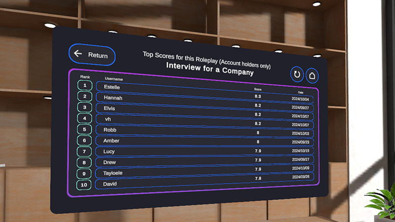 Example leaderboard in the VirtualSpeech app for an interview roleplay.