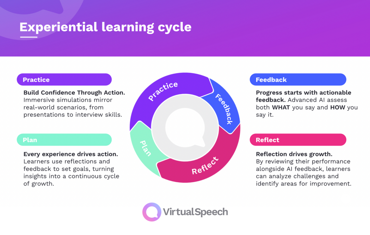VirtualSpeech’s roleplays are grounded in well-established psychological and educational theories, such as experiential learning and deliberate practice. These approaches allow learners to actively engage in realistic scenarios, practice repeatedly, and receive constructive feedback, ensuring deep, long-lasting skill development.