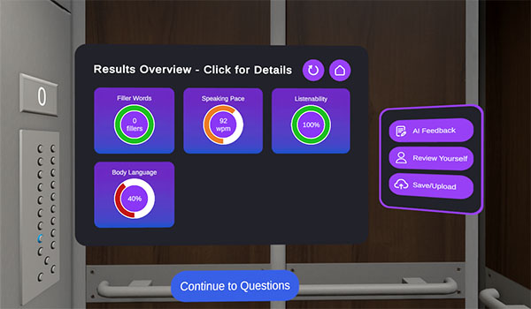 Deliver a 30, 60, or 90-second elevator pitch in one of two virtual elevator environments.