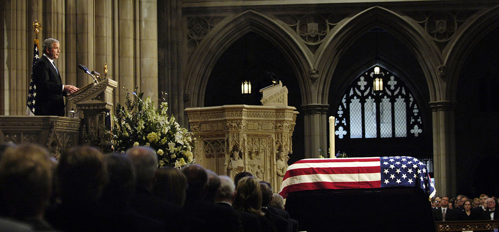President George W. Bush delivers a eulogy during funeral services for former President Gerald R. Ford at the Washington National Cathedral in Washington.