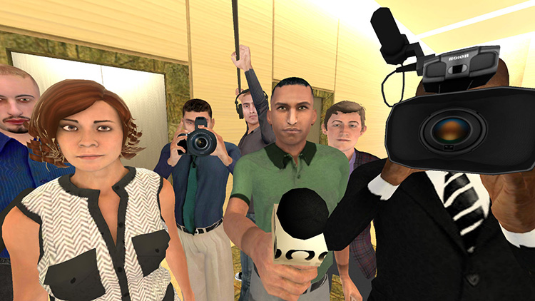 Experience being ambushed by the media in a hotel lobby and practice answering hostile questions.